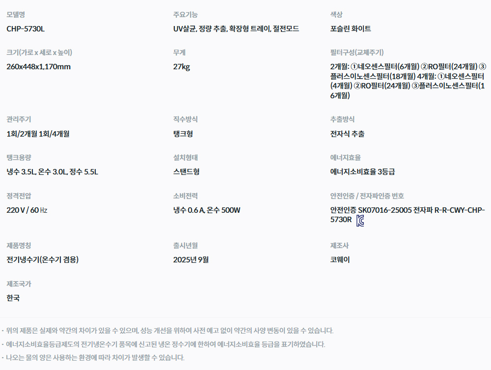 CHP-5730N 코웨이 [코웨이] 워터스탠드 플러스 냉온정수기 (나노트랩필터) 제품분류 정수기 정수방식 탱크형 최저 렌탈가 월 30,400 (렌탈가) 제휴카드 할인가 월 (렌탈가) 3년 5년 6년 방문관리/2개월 제품색상 선택 포슬린화이트 + 0원 할인 제휴카드 보기 렌탈신청 장바구니