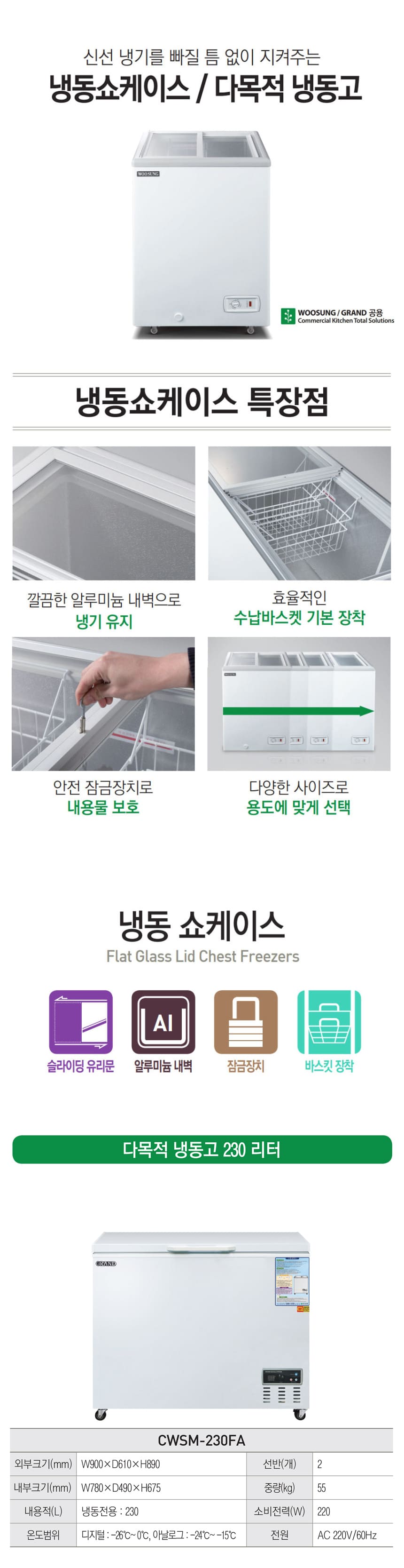 CWSM-230FA 유버스 [그랜드우성] 다목적 냉동 쇼케이스 230L 제품분류 업소용 용량(총량) 200L이상 기능 뚜껑형 최저 렌탈가 월 35,700 (렌탈가) 제휴카드 할인가 월 (렌탈가) 3년 4년 5년 할인 제휴카드 보기 렌탈신청 장바구니