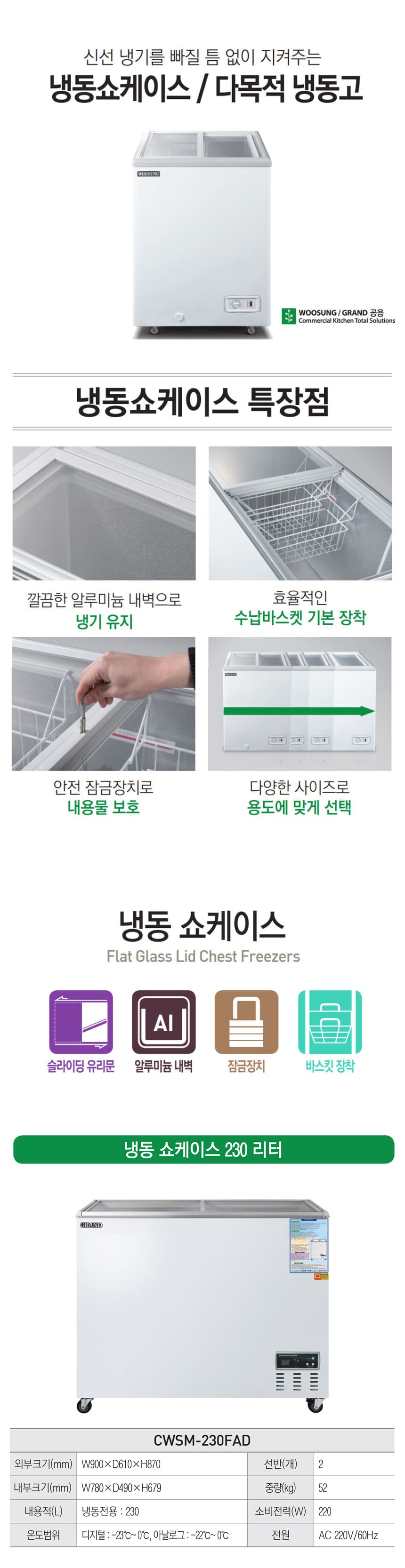 CWSM-230FAD 유버스 [그랜드우성] 냉동 쇼케이스 230L 제품분류 업소용 용량(총량) 200L이상 기능 뚜껑형 최저 렌탈가 월 37,500 (렌탈가) 제휴카드 할인가 월 (렌탈가) 3년 4년 5년 할인 제휴카드 보기 렌탈신청 장바구니