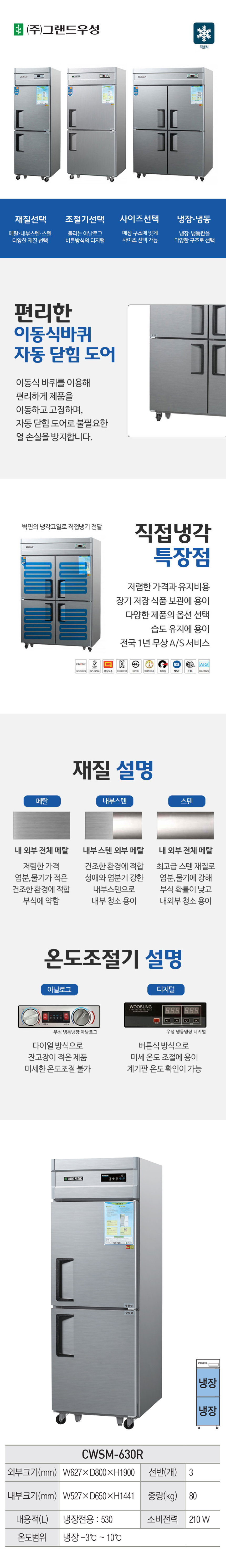CWSM-630R_내부스텐 유버스 [그랜드우성] 직냉식 냉장고 530L 내부스텐 제품분류 업소용 용량(총량) 500L이상 기능 2도어 최저 렌탈가 월 37,700 (렌탈가) 제휴카드 할인가 월 (렌탈가) 3년 4년 5년 할인 제휴카드 보기 렌탈신청 장바구니