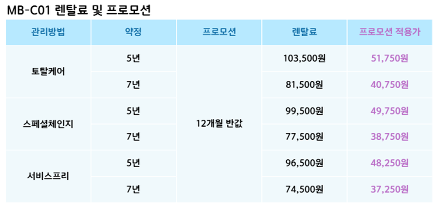 빠르고 간편한 렌탈 상담신청 1800-9012 개인정보 수집/이용 내용보기 동의 미동의 ※ 개인정보수집이용 동의 1. 개인정보의 수집 및 이용목적 : 원활한 렌탈 상담 및 주문을 위한 참조자료로 아래와 같은 항목의 개인정보를 수집하고 있습니다 2. 수집하려는 개인정보 항목 : 필수 수집항목 : 이름, 연락처 3. 개인정보의 보유 및 이용기간 : 수집된 정보는 이용자의 정보 삭제 요구 시까지 보관, 활용하며 수집 및 이용 목적이 달성된 후 해당 정보를 지체 없이 파기합니다. 단순 상담고객 3개월 후 파기 / 계약 고객 12개월 후 파기 4. 개인정보 취급 담당자 : 이름 : 한승현연락처 : 1800-9012 5. 개인정보 수집 동의거부 사항 : 이용자의 개인정보는 원활한 상담을 위해 수집하고 있으며, 동의하지 않을 경우 상담 및 주문이 제한됩니다. [닫기]