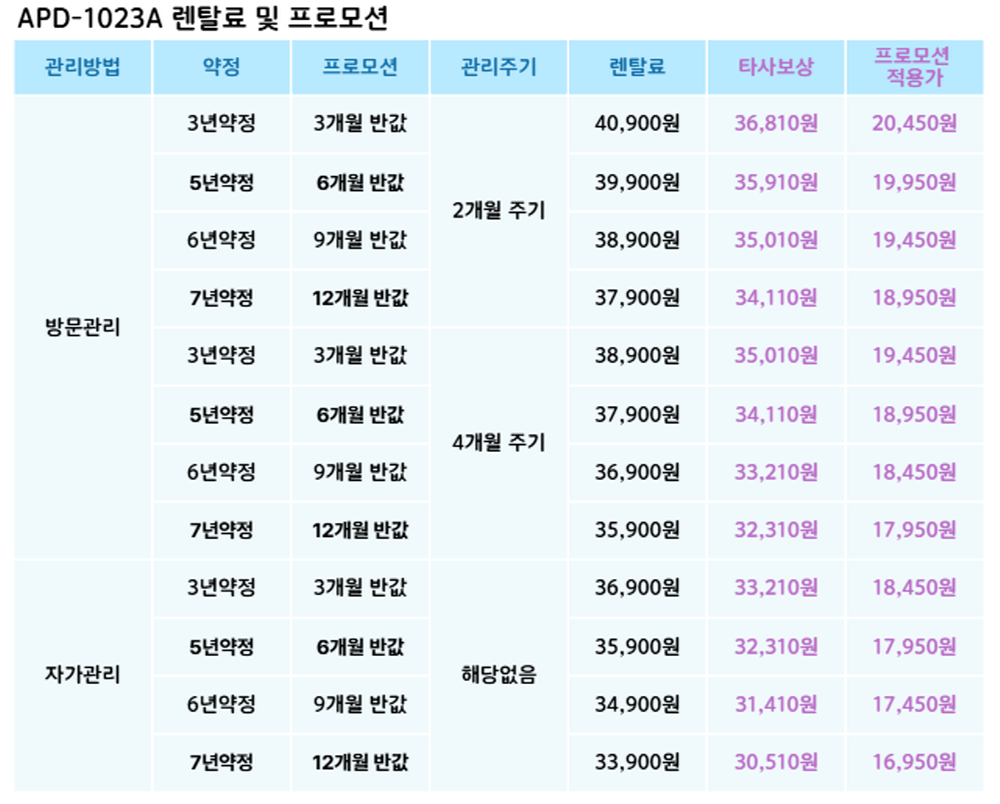 APD-1023A 코웨이 [코웨이] 듀어클린 제습 공기청정기 9평형 제품분류 청정기 기능 제습기능 A/S기간 렌탈기간내 최저 렌탈가 월 33,900 (렌탈가) 제휴카드 할인가 월 (렌탈가) 3년 5년 6년 7년 자가관리 방문관리/4개월 방문관리/2개월 할인 제휴카드 보기 렌탈신청 장바구니