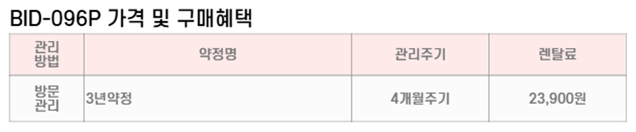 BID-096P SK매직 [SK매직] 향균 비데 파워업 저수압용 제품분류 비데 A/S기간 렌탈기간내 최저 렌탈가 월 23,900 (렌탈가) 제휴카드 할인가 월 (렌탈가) 3년 방문관리/4개월 할인 제휴카드 보기 렌탈신청 장바구니